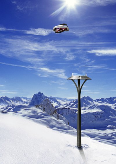 The AARA-drones are based in autarkic stations. These not only shelter the drones, but also serve as a node between the cross-linked avalanche detectors, AARA and the mountain rescue service. This is where all information converges. Solar modules ensure the electric power supply. AARA is protected by a dome that opens up in case of emergency. The station’s platform contains a charging cradle to recharge the batteries of the drone.