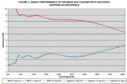 In other optical coating applications, such as polarizing beam-splitters, the polarization effects can be exploited to attain a system goal. Antireflection coatings (AR, ARC) show the greatest reduction in reflectance at a single wavelength or over a very narrow wavelength range. In general it is difficult to attain very low reflectance over more than a 2X range in wavelength. In order to get very broadband performance, the coating designer must strike a compromise between reflectance level and bandwidth. This is the approach used by Deposition Sciences, Inc. (DSI) in designing broadband antireflection (BBAR) coatings for UAS application. The graph in Figure 2 shows BBAR coating performance with a cone-angle average of fifteen degrees. Figure 3 indicates the angle performance of new UAS BBAR coatings from DSI